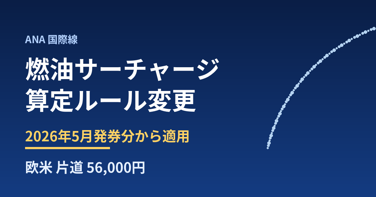 ANA(全日本空輸)は2026年4月20日、国際線の燃油特別付加運賃(燃油サーチャージ)について、算定ルールそのものの変更と上限テーブルの新設を発表しました。2026年5月1日以降の発券分から適用され、日本発の欧州・北米線は片道56,000円と、これまでよりもかなり踏み込んだ水準となっています。