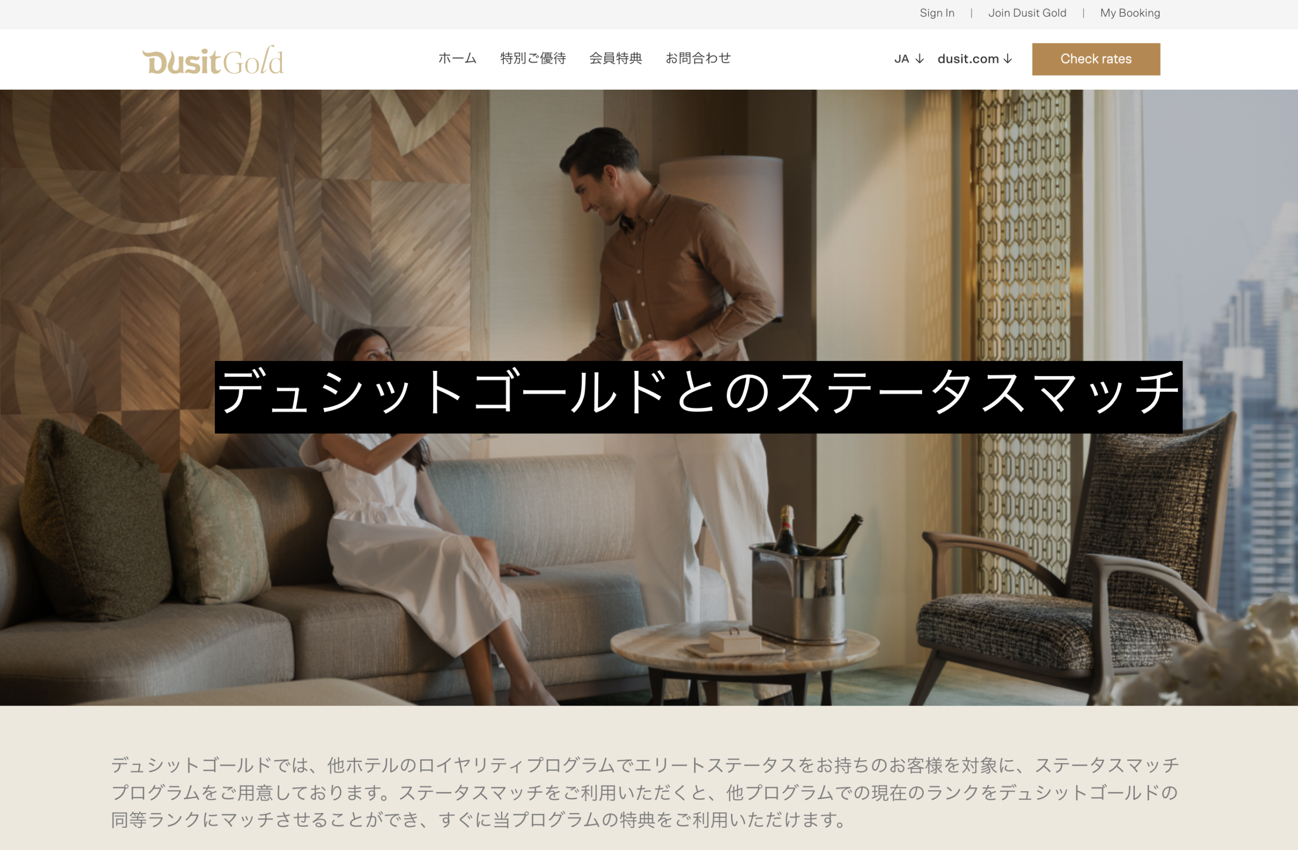 デュシットゴールドとのステータスマッチ デュシットゴールドでは、他ホテルのロイヤリティプログラムでエリートステータスをお持ちのお客様を対象に、ステータスマッチプログラムをご用意しております。ステータスマッチをご利用いただ