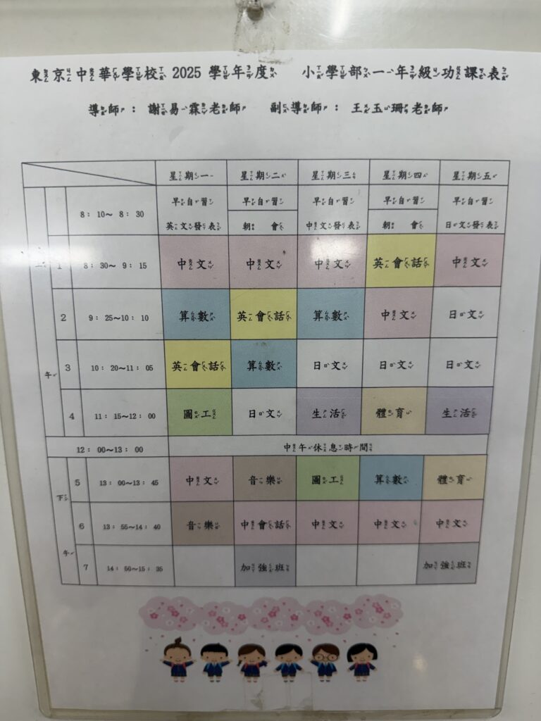 小学校の時間割表。日本語・英語・中国語があるのでトリリンガルになれるかもしれません。